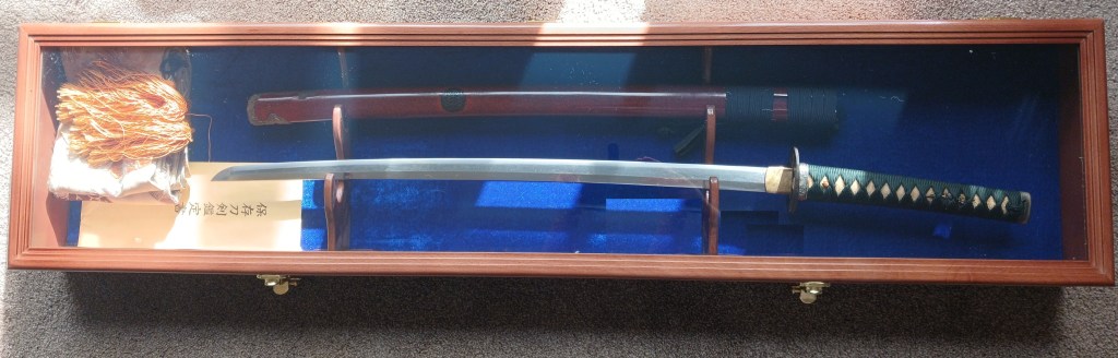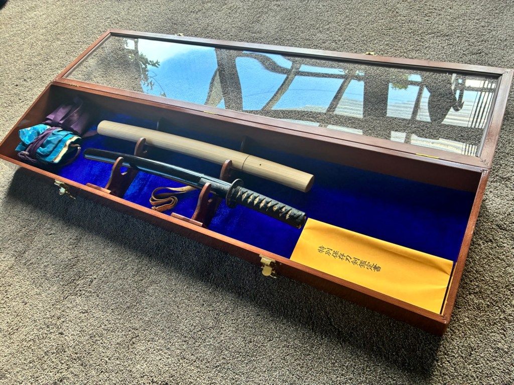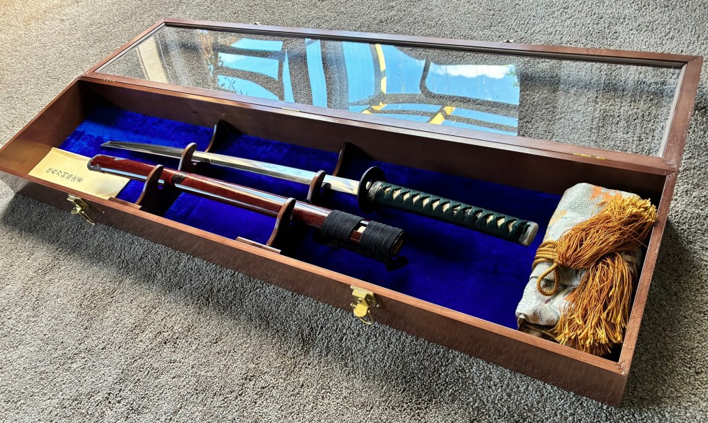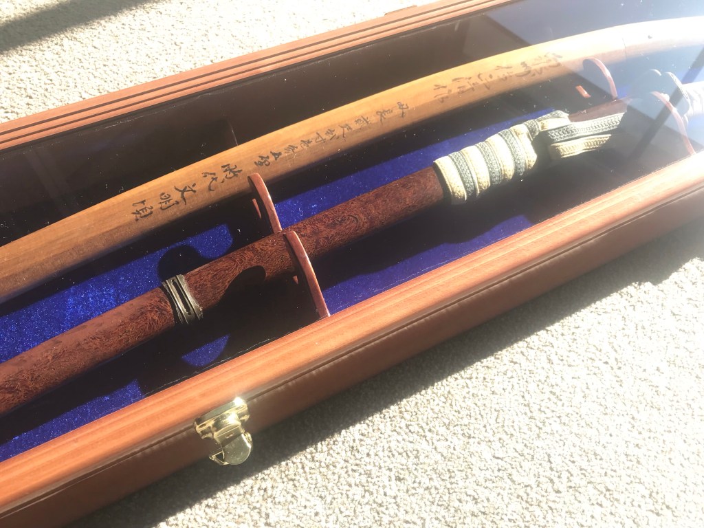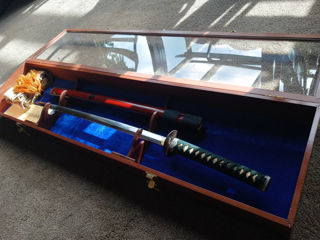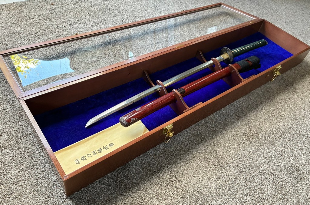 Comes with everything in pictures including hand crafted beautiful wood display case with wall mounts and 2 sword cloths as pictured.