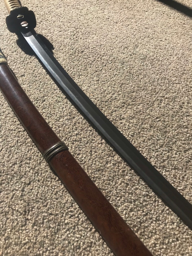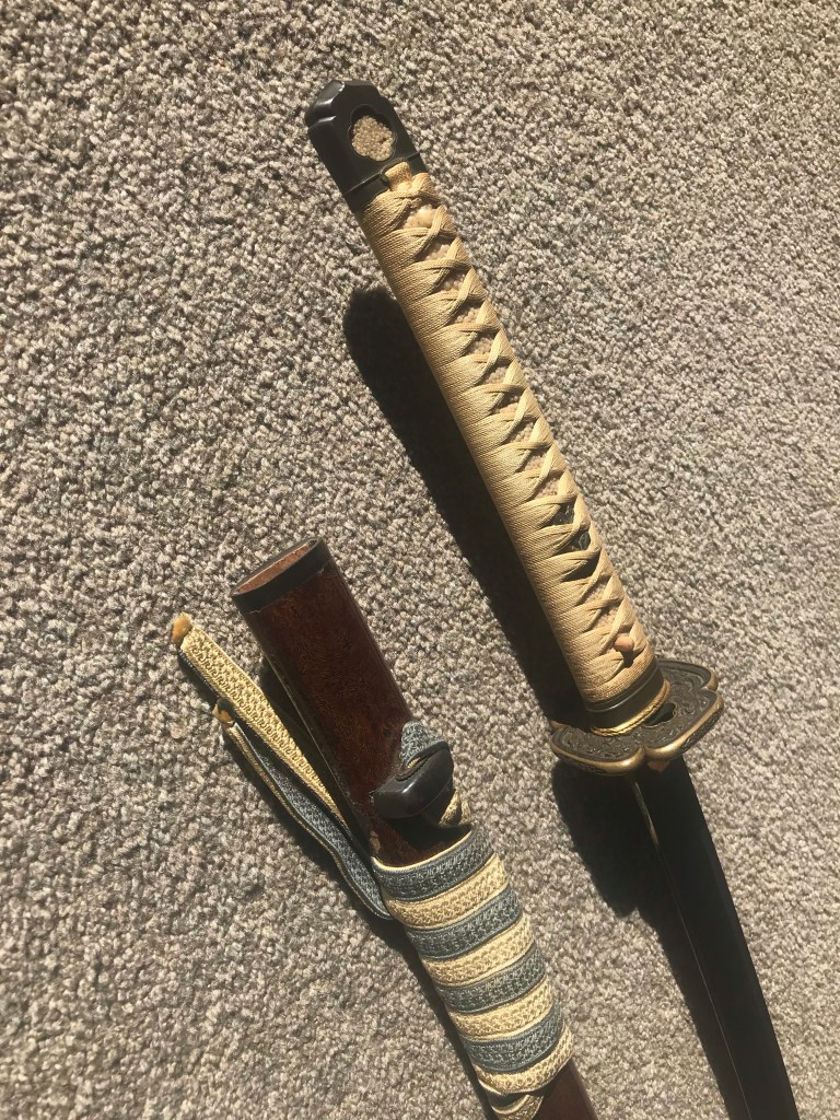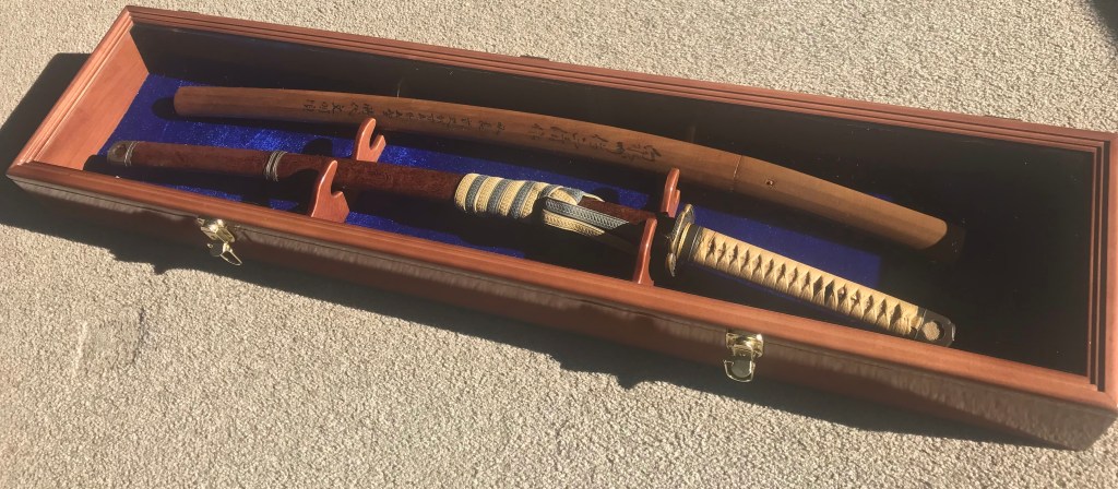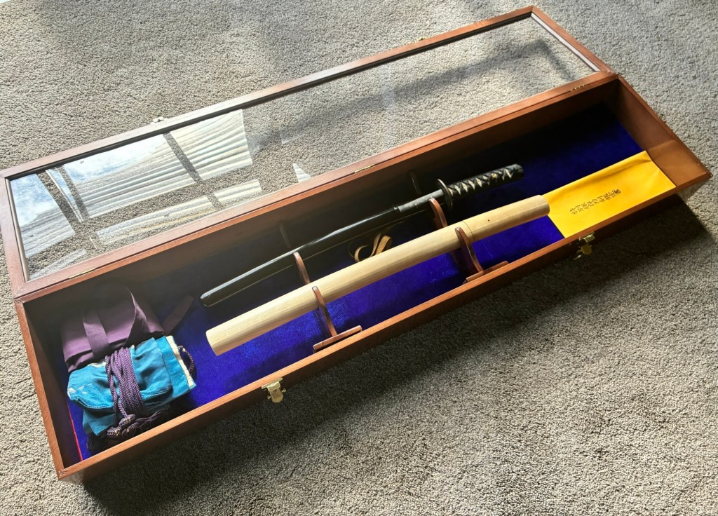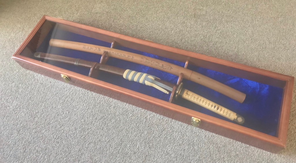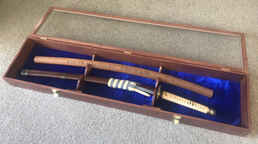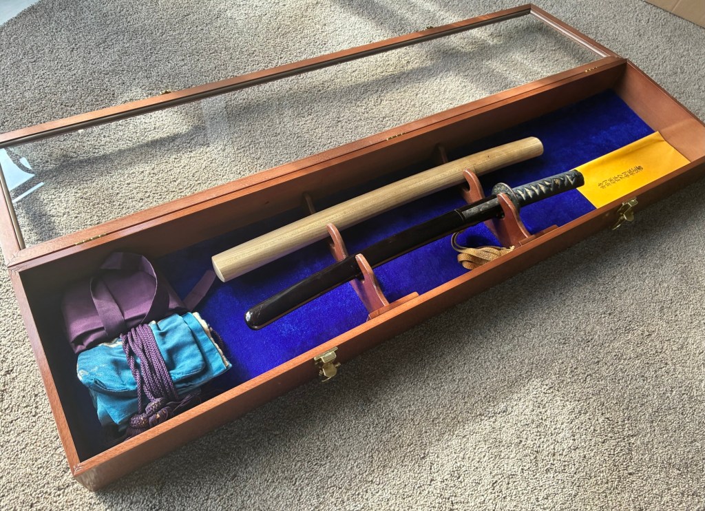 Comes with everything in pictures including hand crafted beautiful wood display case with wall mounts and 2 sword cloths as pictured.