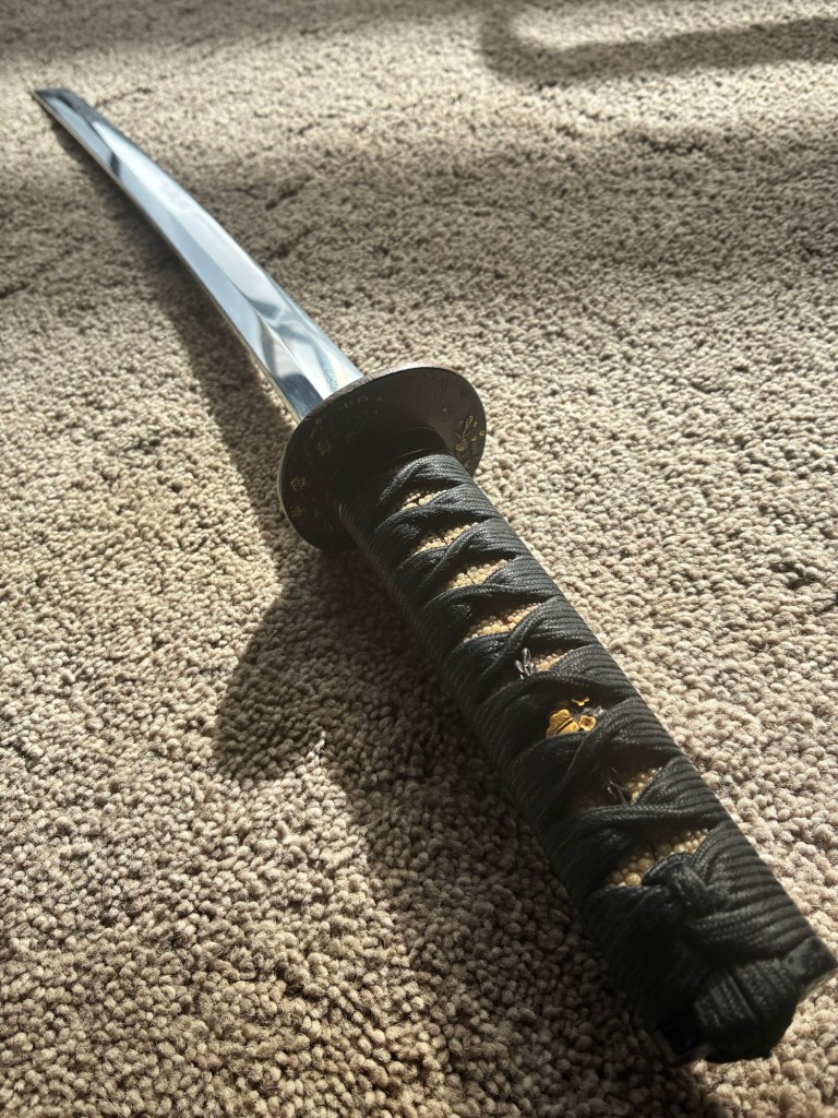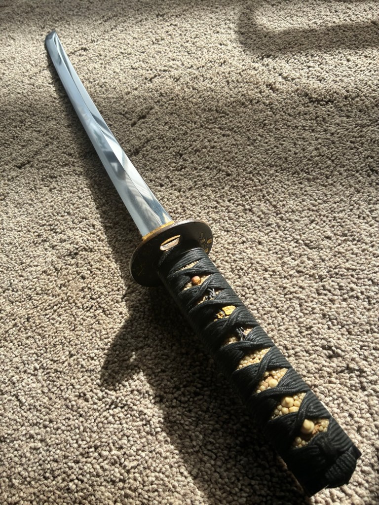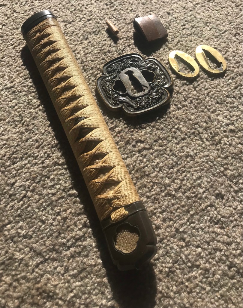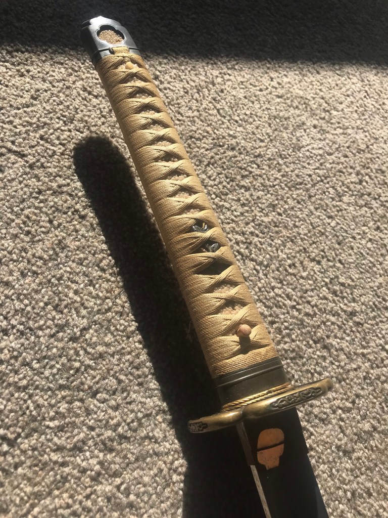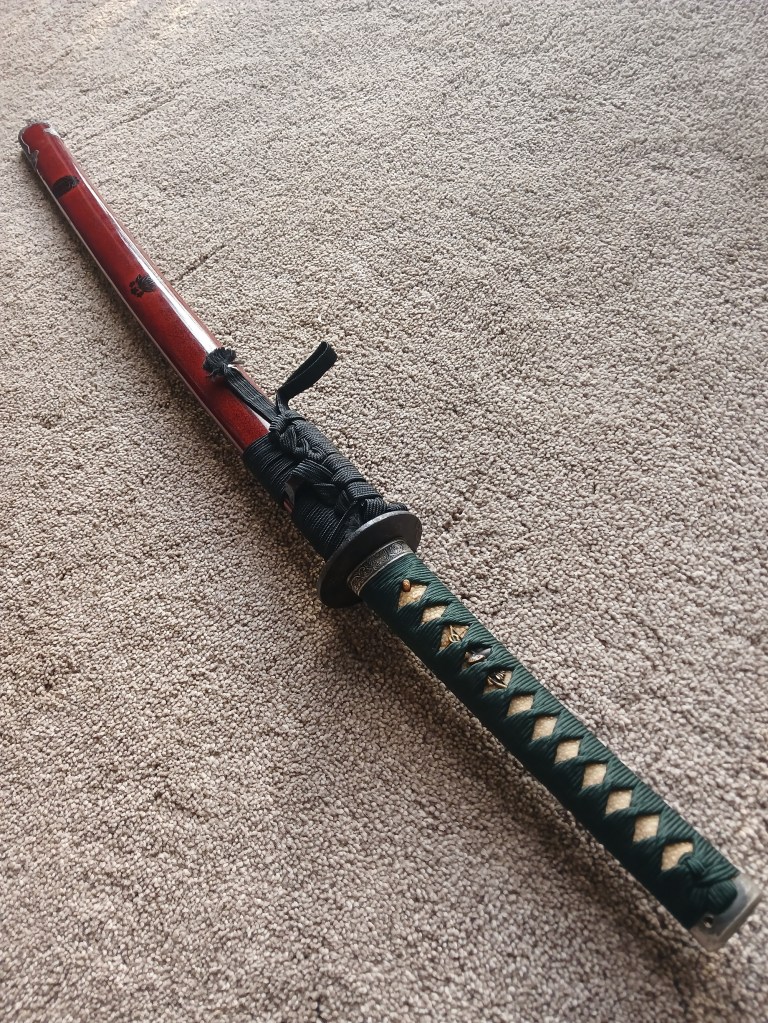 Comes with everything in pictures including hand crafted beautiful wood display case with wall mounts and 2 sword cloths as pictured.