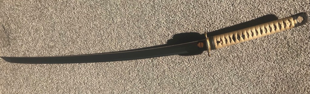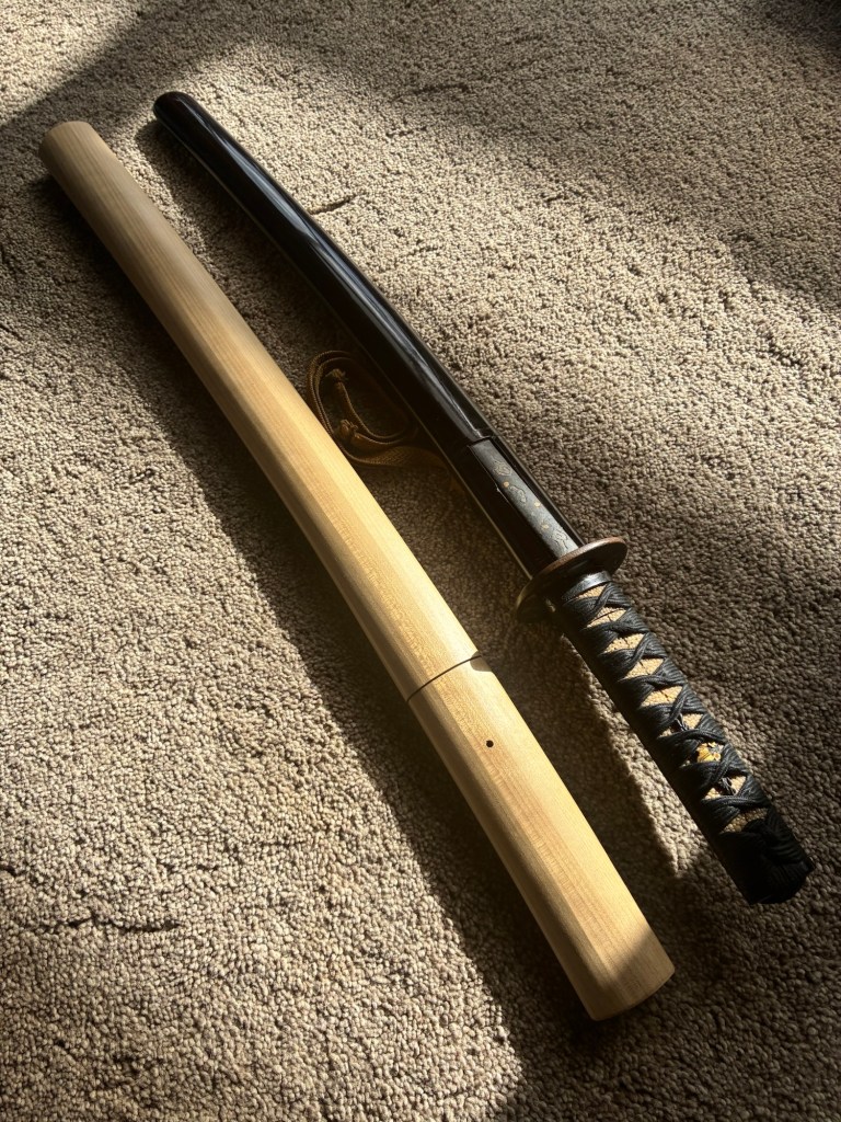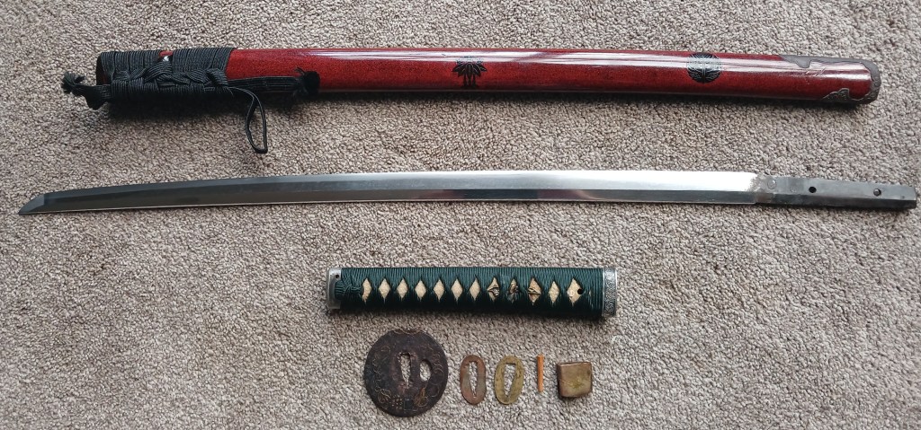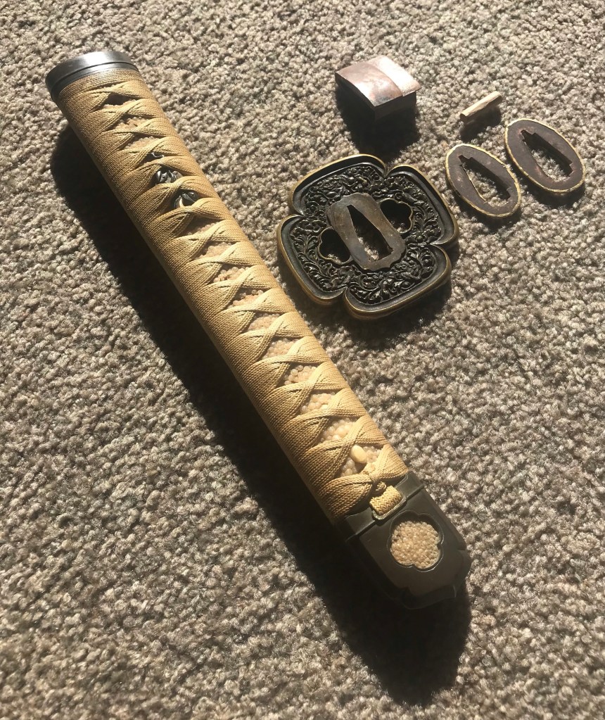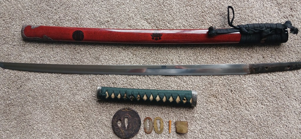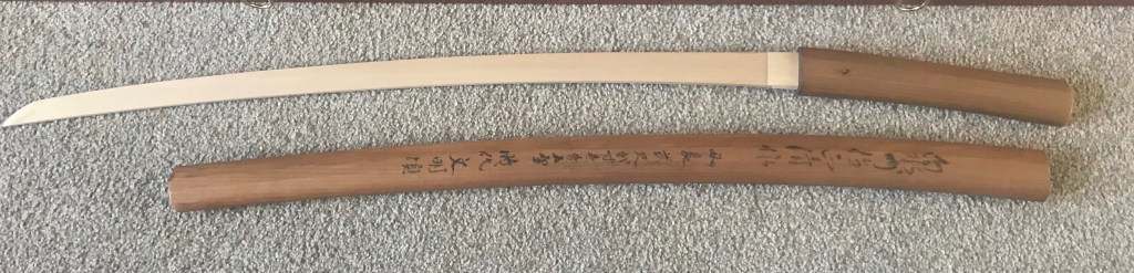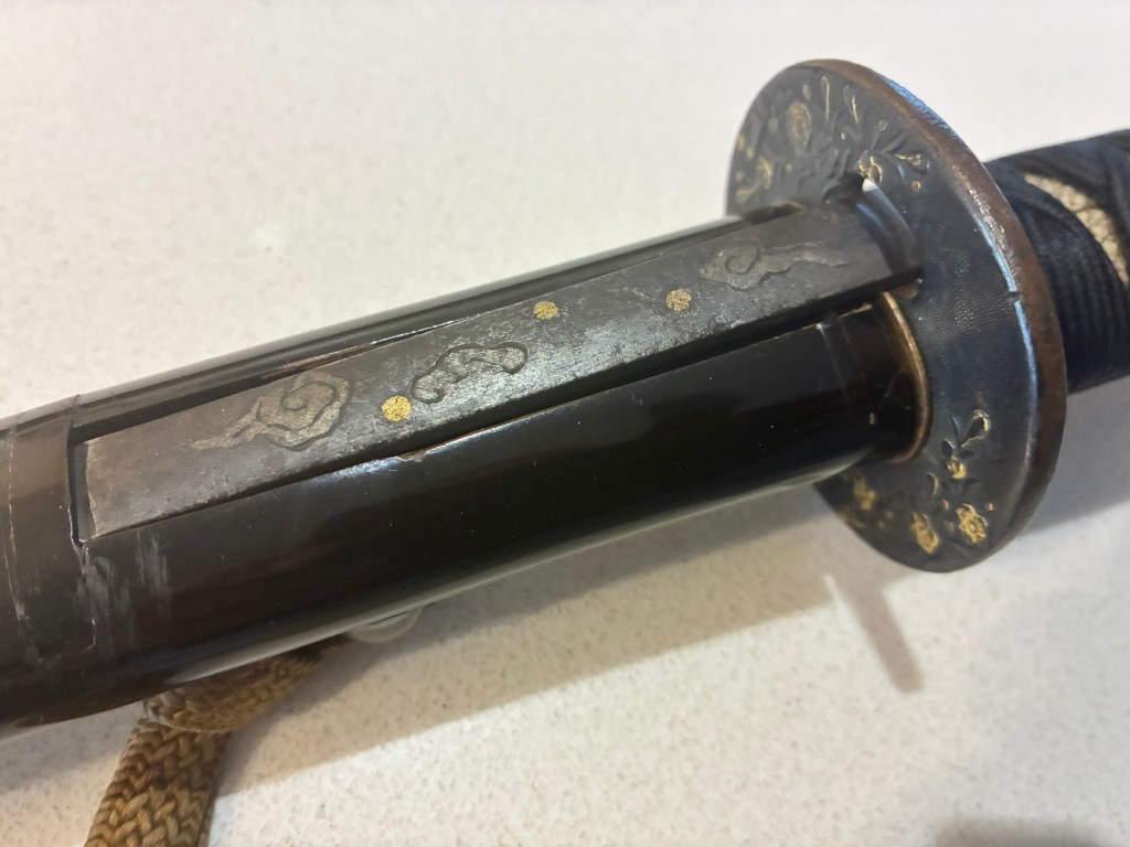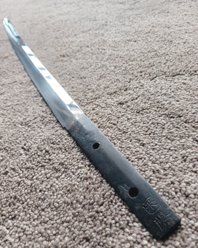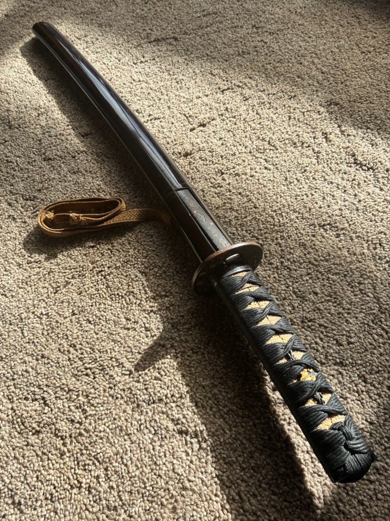 Japanese Samurai sword – Wakizashi with beautiful koshirae with wood tsunagi, in shirasaya + saw blade kozuka.