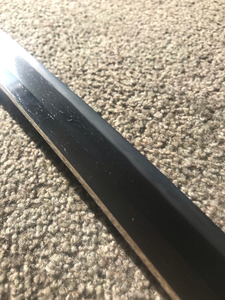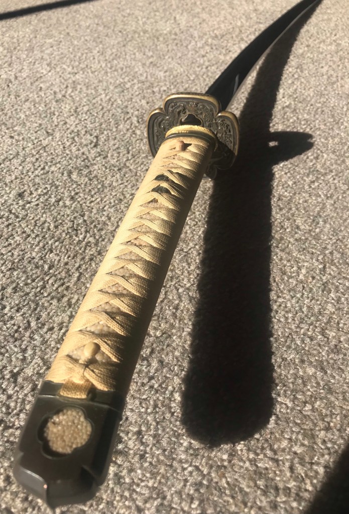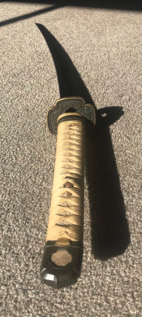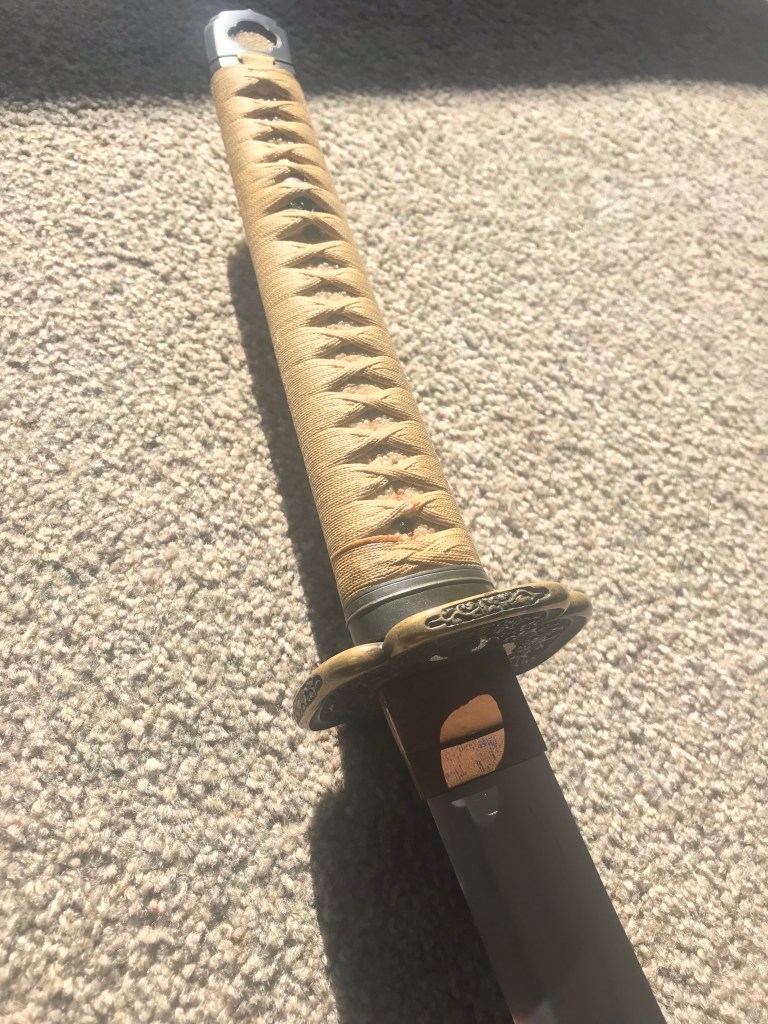 Comes with everything in pictures including hand crafted beautiful wood display case with wall mounts and sword cloth as pictured.